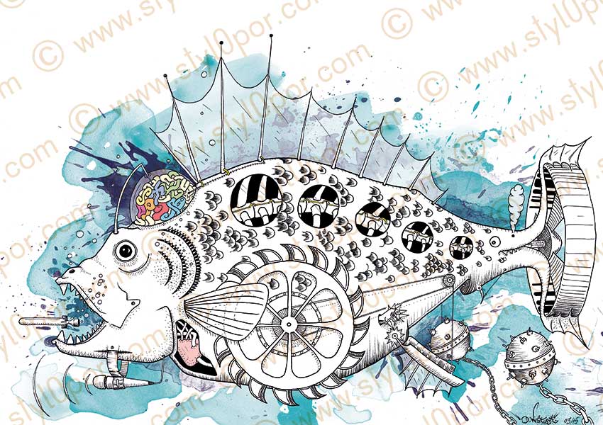 Die Grafik "das fisch." als auch "der languste." sind detailierte Weiterentwicklungen und Verfeinerungen, deren Ursprung auch im Unterwasserbild (UnderWater) zu suchen wäre. Die Detailverliebtheit ist allerdings hier auf einer anderen Stufe, als auch das gedruckte Bild in seiner Größe viel eigenständiger wirkt und stärker für sich spricht.